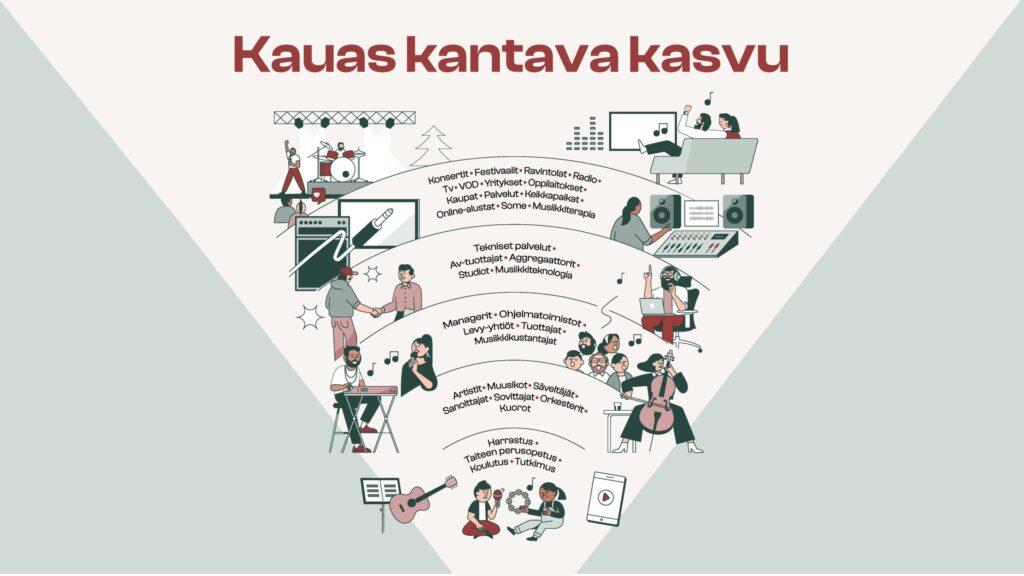 Musiikkialan toimijat ovat julkaisseet yhteisen viestinsä päättäjille uudessa Kauas kantava kasvu -one pagerissa. One-pager kertoo tiiviisti ja tutkimukseen perustuen musiikkialan yhteiskunnallisesta merkityksestä. Viesti on, että musiikkiala on yhteiskunnassa täysin poikkeuksellinen ala, joka kykenee synnyttämään sekä työtä että taloudellista kasvua samaan aikaan, kun se vahvistaa kriisinkestävyyttä ja ihmisten hyvinvointia.